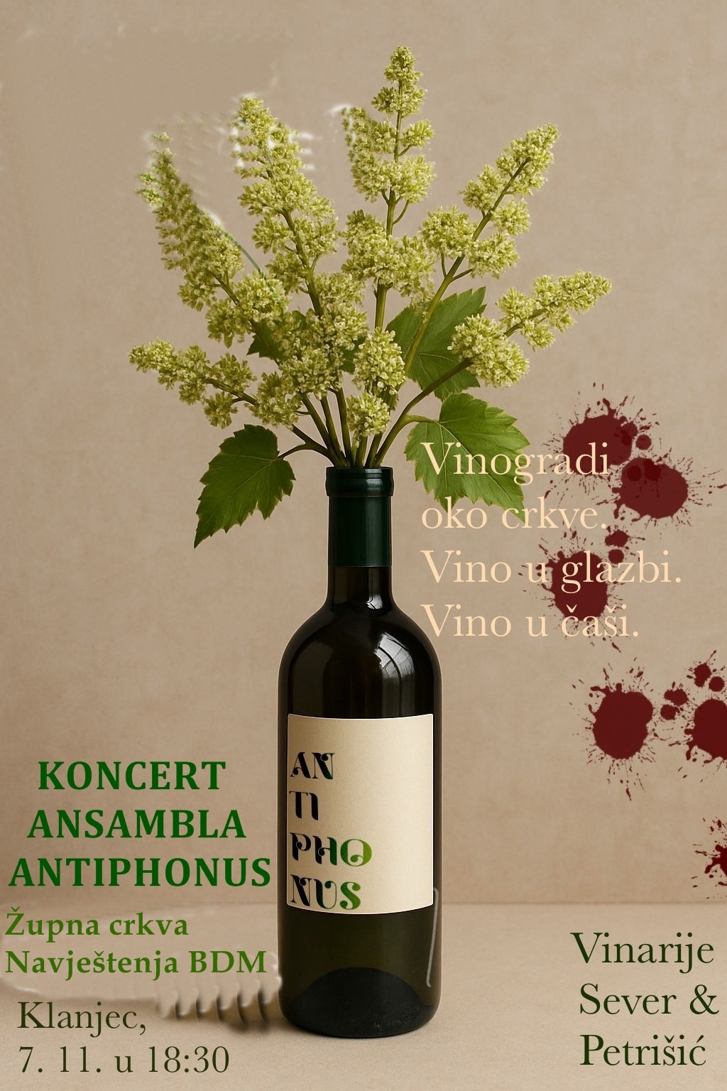 Kako bismo doživjeli povezanost glazbe i arhitekture samostana i crkve, kroz koncert će nas voditi povjesničarka umjetnosti Bernarda Ratančić. Očekuju vas uglazbljeni tekstovi iz Svetog pisma koji govore, uglavnom u metafori, o trsu, lozi, ukorijenjenosti, plodu i vinu, a kako je samostanski vinograd bio onaj hortus conclusus koji je spasio staru sortu Sokol,  glazba će se iz interijera crkve preliti u samostanski podrum gdje će posjetitelji moći uživati uz svjetovnije zvuke Kuljerića, Viga Kovačića i tradicijske pjesme, uz degustaciju i upoznavanje klanječkih vina, autohtone sorte Sokol, pjenušca i priču o vinarskoj tradiciji obitelji Sever i Petrišić