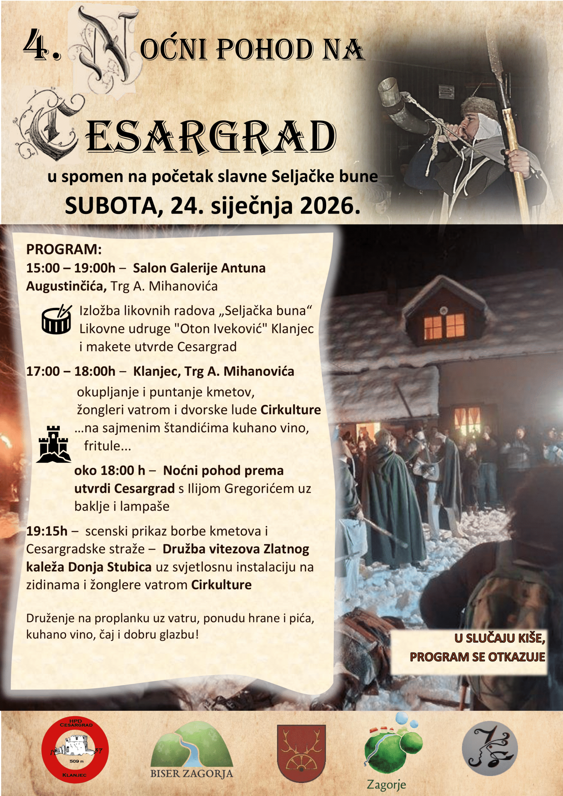 Još jednim, sad već četvrtim NOĆNIM POHODOM NA CESARGRAD Hrvatsko planinarsko društvo “Cesargrad” Klanjec i Turistička zajednica Biser Zagorja, u suradnji s Družbom vitezova Zlatnog kaleža iz Donje Stubice, Kulturnim centrom Klanjec i uz potporu Krapinsko-zagorske županije i Grada Klanjca, simbolično će obilježiti početak slavne Seljačke bune koja je započela napadom na Cesargrad u noći s 27. na 28. siječnja 1573. godine.