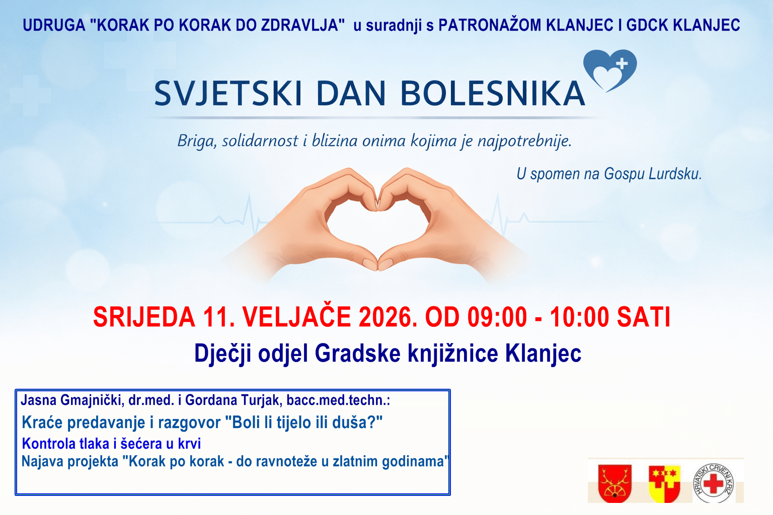 Udruga “Korak po korak do zdravlja”, patronažne sestre i Gradsko društvo Crvenog križa obilježti će Svjetski dan bolesnika prigodnim susretom s građanima u srijedu 11. veljače u vremenu od 09:00 – 10,00 sati na Dječjem odjelu Gradske knjižnice.