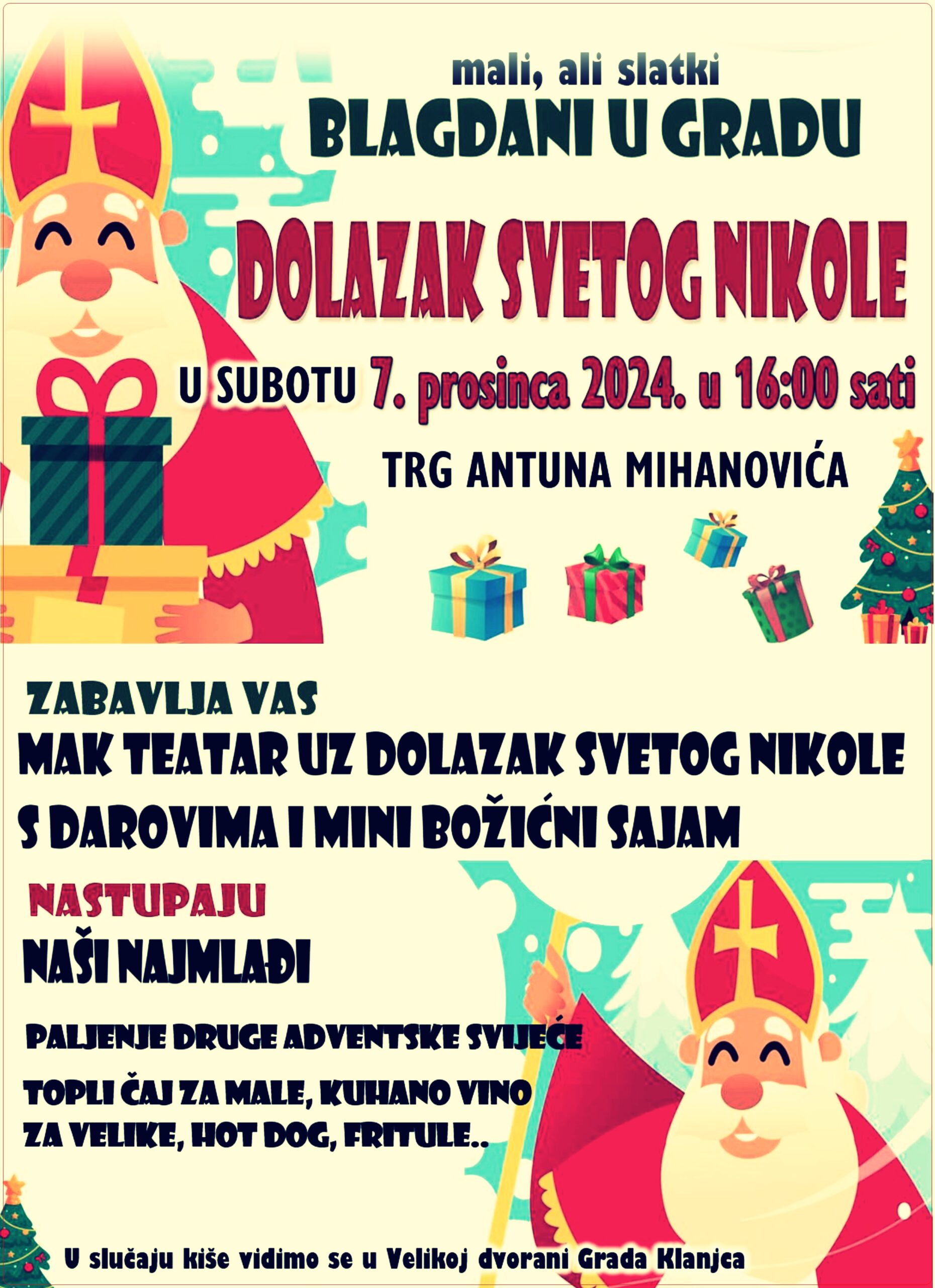 Najvažnije od svega ipak je da će nam se pridružiti i SVETI NIKOLA s malim darovima za svu djecu mlađu od 12 godina koja u subotu dođu na naš trg!
